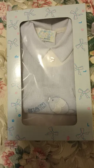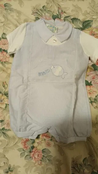 Bellissimo pagliaccetto azzurro per neonato, completo di scatola originale. - Taglia 2. - Colore azzurro. - Dettaglio con disegno beach e balenottera. - Chiusura con bottoni sul colletto.