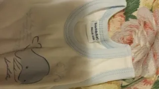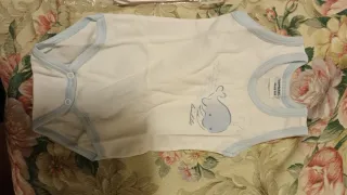 Body per neonato sbracciato, taglia 6 mesi. Presenta una simpatica stampa di una balena. - Colore bianco con bordi azzurri. - Chiusura con bottoncini a pressione sul cavallo.