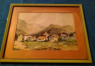 Quadro/stampa da parete con una scena di montagna. Cornice in legno. Passepartout arancione.