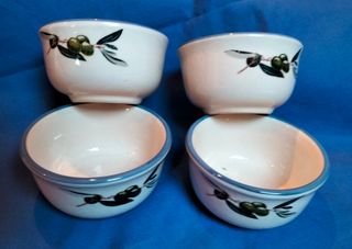 Set di quattro ciotole in ceramica con un grazioso decoro di olive. Ideali come salsiere o per aperitivi. Design elegante con bordo blu.