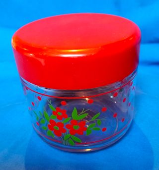 Set di due contenitori da cucina con coperchio rosso e decorazione floreale. Ideali per caffè, zucchero o sale. Realizzati in vetro con coperchio in plastica.