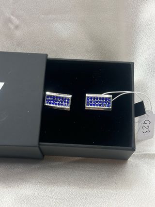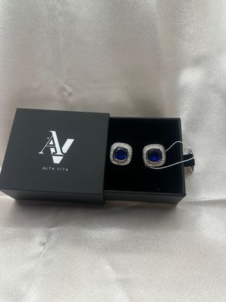 Eleganti gemelli da polso Alta Vita. - Design quadrato con pietra blu centrale. - Cornice con piccole pietre luminose. - Dettagli in argento.