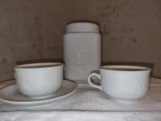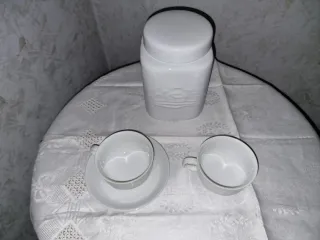 Set composto da una biscottiera, due tazzine da caffè e un piattino Mulino Bianco anni 80/90. - Biscottiera con coperchio. - Due tazzine con decoro floreale. - Un piattino abbinato. Peso: Biscottiera: 1kg e 144 grammi Tazzine: 370 grammi (1 tazzina: 185 grammi) Piattino: 206 grammi Biscottiera leggermente scheggiata sotto (come da ultima foto)