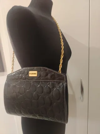 Elegante borsa vintage Gianfranco Ferre con finitura effetto coccodrillo. - Dettagli in metallo dorato. - Tracolla a catena. - Design classico e raffinato.