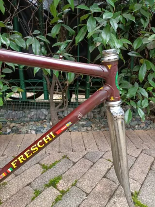 Telaio per bicicletta da corsa vintage, realizzato in acciaio Columbus, taglia piccola. colore molto bello bordeaux, forcella cromata - Decals Freschi - Materiale: Acciaio Columbus - Tipo: Telaio da corsa - misure: 52 x 50 cm (orizzontale X verticale) Ideale come base per costruire bici di tipo eroica il telaio viene venduto con serie sterzo campagnolo e movimento centrale Possibile il ritiro a mano su Milano