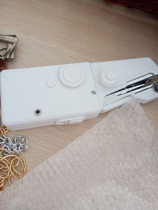 piccola macchina da cucire, a batteria, si cede per incapacità manuale! insieme a ritagli di stoffa, cerniere, catenelle e fermagli cinture riciclate.