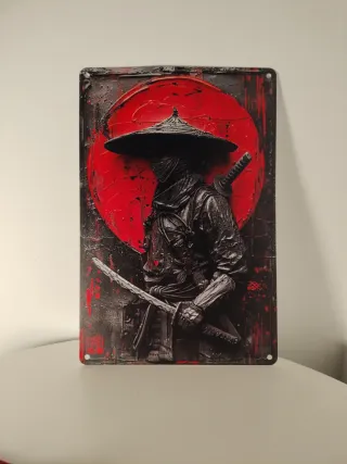 Targa decorativa in metallo con un guerriero samurai. L'immagine presenta un design artistico con un cerchio rosso sullo sfondo. - Materiale: Metallo - Design: Guerriero Samurai - Colore: Nero e Rosso