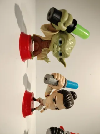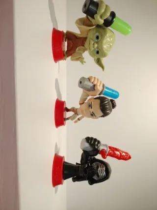 Set di tre action figure Star Wars. - Personaggi: Yoda, Rey, Kylo Ren. - Ogni personaggio ha una spada laser. - Base rossa inclusa per ogni figura.