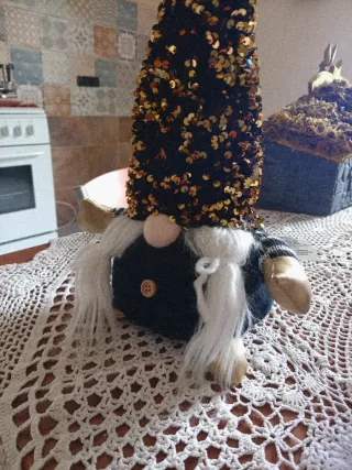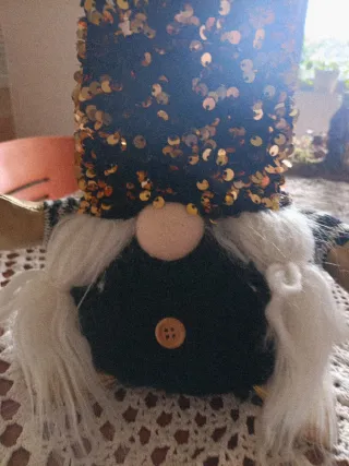 Un simpatico nano decorativo, perfetto per dare un tocco festivo alla tua casa. - Cappello decorato con paillettes dorate. - Barba bianca folta. - Dettagli in tessuto. Alto 37 cm usato raramente
