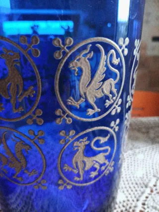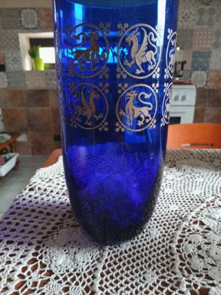 Elegante vaso in vetro blu con un motivo decorativo dorato che ricorda lo stile egizio. Un pezzo unico che aggiunge un tocco di classe a qualsiasi ambiente. - Motivo decorativo dorato con figure. - Finitura lucida. Alto 30 cm diametro 15 cm