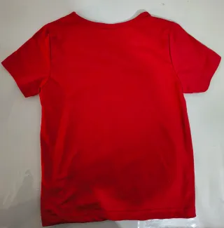 T-shirt rossa per bambino, taglia 4 anni. Realizzata in poliestere elasticizzato. - Maniche corte. - Girocollo. - Stampa colorata con personaggio e scritte TUNG TUNG e TUNG SAHUR.