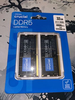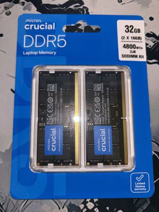 Kit Crucial DDR5 32 GB (2×16 GB) 4800 MHz CL40, modello CT2K16G48C40S5. RAM DDR5 SODIMM 262-pin per laptop/notebook e mini PC compatibili con memoria DDR5, configurazione 2×16 GB in dual channel. Specifiche: 32 GB totali, 4800 MHz, CL40, 1,1 V, moduli neri compatti pensati per piattaforme portatili moderne. PRODOTTO NUOVO – SIGILLATO Confezione originale, mai aperta, mai montata. Spedizione tramite Wallapop Envíos con tracciamento; disponibile consegna a mano se preferito.