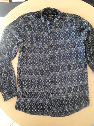 Camicia da uomo a maniche lunghe con una fantasia geometrica astratta nei toni del blu e del nero. - Fantasia geometrica astratta - Colletto classico Condizioni ottime, mai indossata.