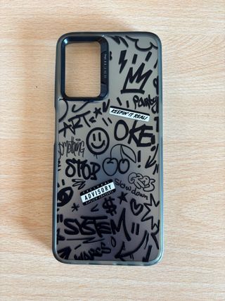 Custodia per OPPO A96 con un design unico stile graffiti. - Grafiche nere su sfondo grigio fumé. - Stampa KEEPING IT REAL e ADVISORY.