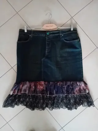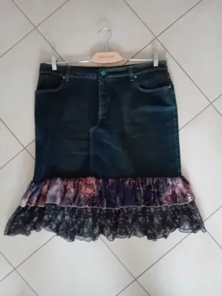Gonna donna jeans MARIELLA BURANI LE SPORTIVE. - Chiusura con bottone e zip. - Tasche anteriori e posteriori. - Fondo con balze in tessuto stampato e trasparente. Misura vita 48 cm. Condizioni ottime pari al nuovo.