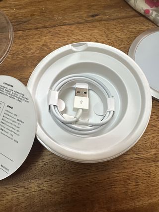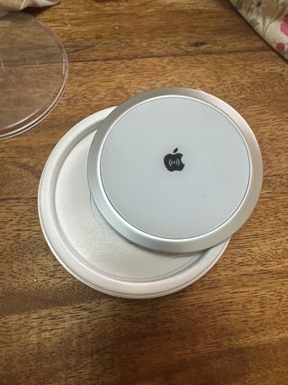 Caricatore wireless Apple di forma circolare. - Design sottile e moderno. - Finitura in alluminio e plastica bianca.