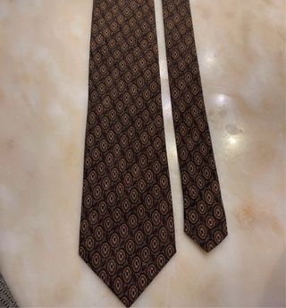 Elegante cravatta in pura seta con un motivo geometrico. - Materiale: 100% Seta - Colore: Marrone e oro - Design: Motivo a rombi con dettagli floreali