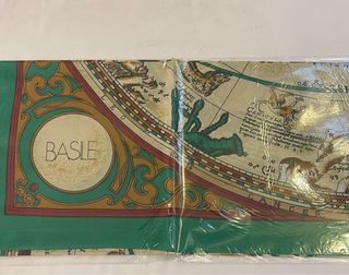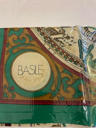 Elegante foulard in pura seta firmato Basile, ancora nella sua confezione originale. - Tessuto: 100% Seta - Design: Motivo astronomico e decorativo - Colore: Oro e verde