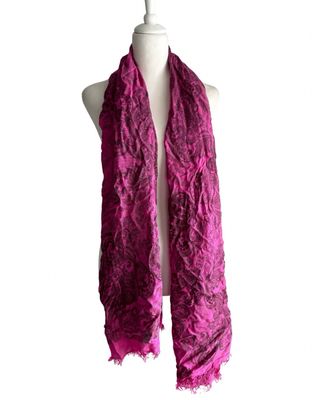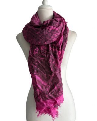 Sciarpa in bamboo di un vivace colore fucsia con una stampa scura. - Morbida al tatto. - Design con frange alle estremità.