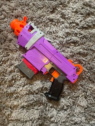 Fucile giocattolo Nerf ispirato a Fortnite. Presenta una combinazione di colori viola e arancione. - Design ispirato a Fortnite. - Colore principale viola. - Dettagli in arancione.