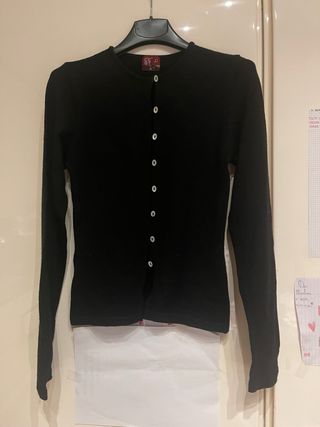 Cardigan da donna con apertura frontale a bottoni.45% lana 45% acrilico 10% poliestere misure spalle 32 lunghezza 53 - Scollo rotondo. - Maniche lunghe. - Vestibilità aderente.