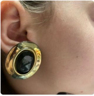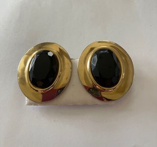 Eleganti orecchini a clip con finitura in metallo lucido e una pietra centrale di colore nero. - Design ovale. - Dettaglio in metallo dorato lucido.