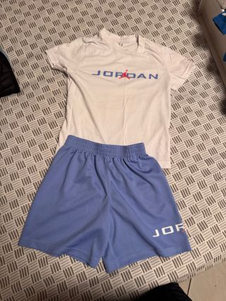 Completo Jordan per bambino, composto da maglietta e pantaloncini. - Maglietta bianca con logo Jordan blu e rosso. - Pantaloncini blu chiaro con logo Jordan bianco e rosso.