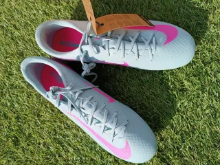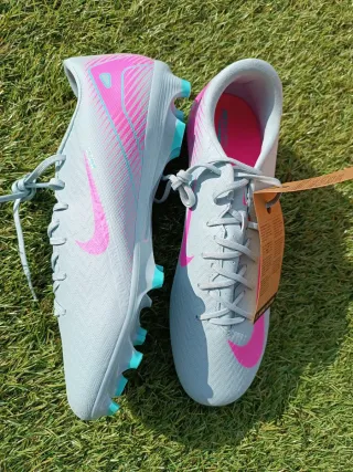 Scarpe da calcio Nike Mercurial con un design accattivante. - Colore grigio con dettagli rosa e azzurri. - Logo Nike a contrasto. - Suola con tacchetti per campi in erba. Taglia 44