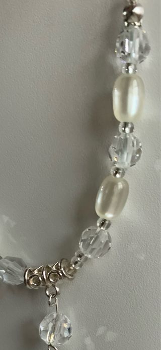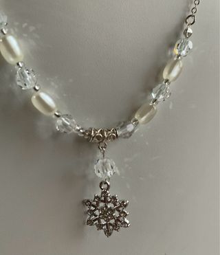 Elegante parure con perle e cristalli, impreziosita da un ciondolo a forma di fiocco di neve. - Perle ovali in madreperla - Cristalli swarovski sfaccettati. - Ciondolo fiocco di neve con strass. set realizzato a mano pezzo unico