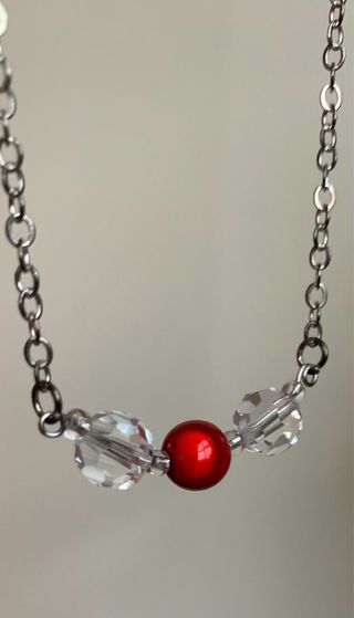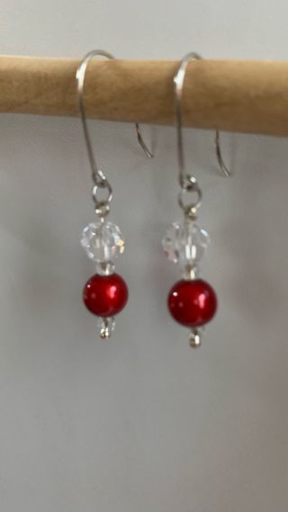 Eleganti orecchini pendenti con perle rosse laser, fosforescenti alla luce diretta, e perline in Swarovski cristal, realizzata a mano - Design raffinato. - Chiusura a monachella.