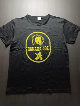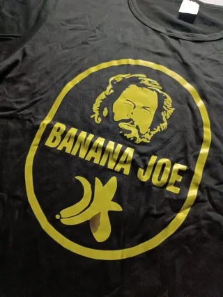 Maglietta nera con stampa Banana Joe e il volto di Bud Spencer. - Stampa gialla. - Design iconico. -taglia L per sicurezza verificare le misure: Spalle 46 cm Lunghezza 66 cm. -Nuova, mai utilizzata confezione aperta solo per fare le foto.