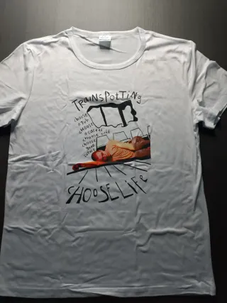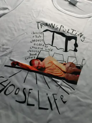 Maglietta con stampa Trainspotting e la celebre frase Choose Life. - Design ispirato al film Trainspotting. - Grafica con citazioni e immagine iconica. -TagliaL, ma veste più piccolo,per sicurezza verificare le misure Spalle 42 cm Lunghezza 44 cm Nuova mai utilizzata confezione aperta solo per fare le foto