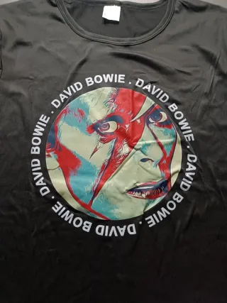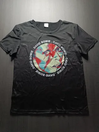 Maglietta nera con iconica stampa di David Bowie. - Stampa Aladdin Sane multicolore. - Girocollo a maniche corte. - Taglia L, ma veste più piccolo, per sicurezza verificare le misure: Spalle 44 cm Lunghezza 64 cm. Nuova mai usata confezione aperta solo per fare le foto