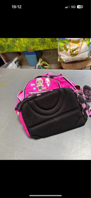 Zaino con simpatici personaggi LOL Surprise. - Colore principale fucsia. - Dettagli neri con fantasia a catene. - Due personaggi LOL Surprise applicati sul davanti. - Tasca frontale con zip.