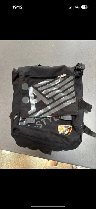 Zaino nero con logo A-STYLE. - Logo frontale con design a strisce. - Patch A-STYLE Milano 1999 sul davanti. - Dettagli tricolore (verde, bianco, rosso) sulla tasca frontale.