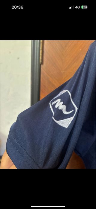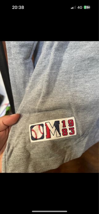 Maglietta a maniche lunghe da uomo, taglia M. - Colore grigio melange. - Patch con logo sul petto e sulla manica. - Inserti blu sulle spalle. - Collo a polo con bottoni e dettagli rossi e bianchi.