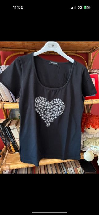 T-shirt nera con un bellissimo cuore decorato con strass. - Design a cuore con strass. - Scollo ampio.