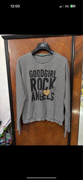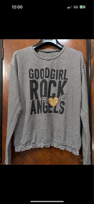 Maglione a maniche lunghe con fantasia a righe orizzontali. - Stampa GOODGIRL ROCK ANGELS sul davanti. - Dettaglio a forma di cuore con paillettes.
