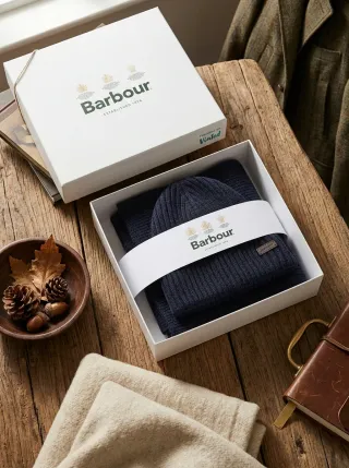 Set regalo barbour cappello più sciarpa blu, mai usato, nuovo nella sua confezione originale