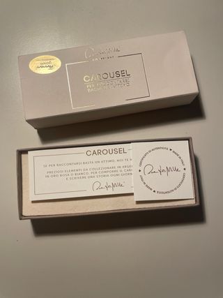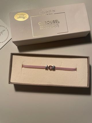 Delicato braccialetto della linea Carousel, perfetto per raccontare un momento speciale. Presenta due graziosi ciondoli. - Ciondoli a forma di bimbo e bimba. - Filo elastico rosa con trama. - Scatola originale Ferrari Gioielli inclusa.