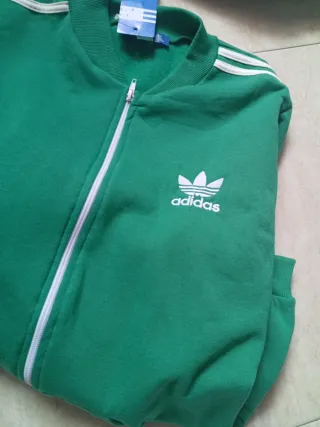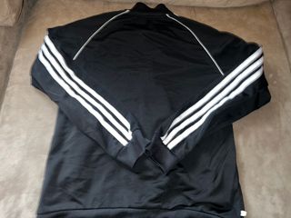 Set sportivo Adidas originale in colore nero, che include giacca e pantaloni. - Giacca con cerniera completa. - Design con le iconiche tre strisce sulle maniche. - Tasche laterali con cerniera sulla giacca. - Pantaloni abbinati.