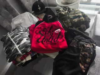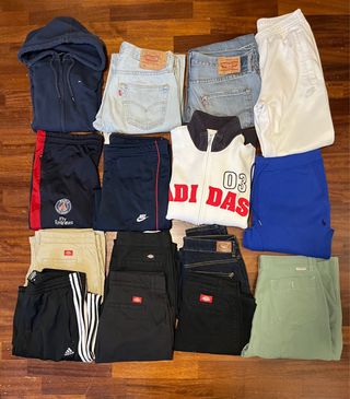 Lott di abbigliamento variegato con diverse vesti. Taglie tra M e L. 13 magliette: 2 adidas, 1 Pepe Jeans, 4 NY Yankees, 7 altre marche. 1 set di pantaloncini camouflage. 1 felpa senza cappuccio. 4 pantaloni: 2 NY Yankees, 1 Pyrex 23 e 1 camouflage. 4 giacche: 1 militare in montone, 1 giacca impermeabile Independent, 1 Ecko e 1 stile urbano. 2 marsupi. 1 berretto. 1 organizer per armadio.