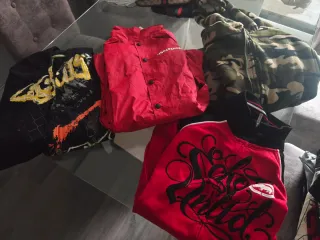 Si vende questo set di abbigliamento per chiusura negozio. Tutto nuovo con etichetta. La maggior parte del marchio JVZ. Totale 15 capi. Nelle foto manca una felpa gialla e due pantaloni corti da cerimonia.