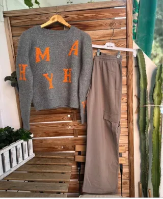 Set di abbigliamento composto da un maglione e un pantalone. - Maglione in maglia grigio con lettere arancioni. - Pantalone cargo grigio. Stradivarius