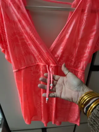 Pezzo di abbigliamento da donna con un design vibrante. Stampa geometrica, scollo a V, dettaglio con cordoncino regolabile in vita.