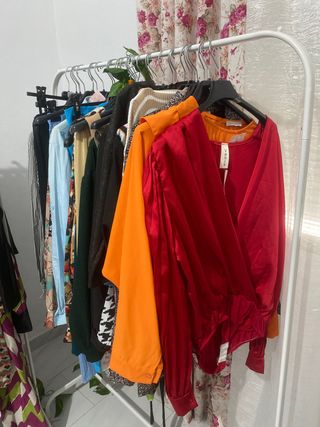 Lotto di capi di abbigliamento vari per chiusura negozio. Include diverse parti di vari stili e colori. Camicie, bluse, body... In totale 20 capi. Nuovi con etichette. Ideale per mercatini o negozi.
