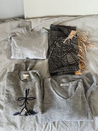 Set di vari capi di abbigliamento Stradivarius. - Blusa con stampa floreale a maniche lunghe. - Blazer a righe sottili in tonalità lilla. - Cardigan in maglia fine color bordeaux. - Cardigan in maglia fine grigio. - T-shirt a maniche lunghe grigia con schiena scoperta. - T-shirt senza maniche bianca. - Canotta bianca.