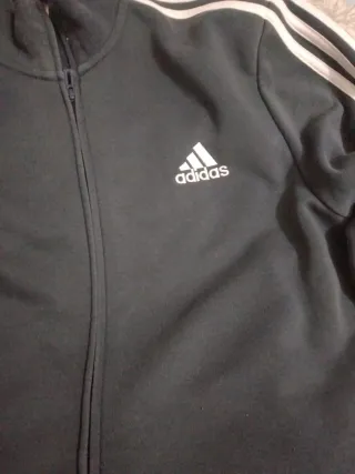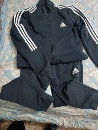 Set sportivo Adidas in due pezzi. Taglia 13/14 per la felpa e 14/15 per i pantaloni. - Felpa con cerniera completa. - Pantaloni con cintura elastica. - Design con strisce laterali.