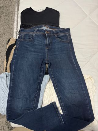 Consistenza di: pantaloni a quadri Stradivarius 36, pantaloni neri Mango S, pantaloni in similpelle Stradivarius beige 36, maglione con collo alto S Cortefiel, maglione traforato Stradivarius S, maglietta verde scuro con spalline brillanti di Stradivarius S. Tutto in perfette condizioni