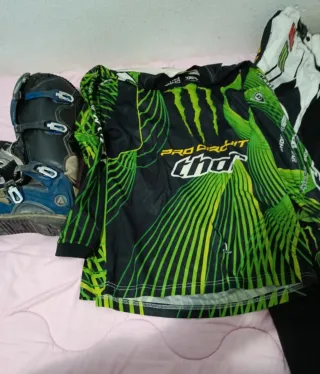 Set di abbigliamento per motocross con un design accattivante. - Maglietta a maniche lunghe con stampa. - Pantaloni abbinati con dettagli. - Stivali da motocross con chiusure.